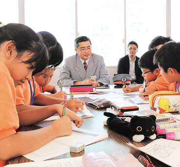 第3講座の冒頭、自己紹介やインタビューの練習をする子どもたち。そこへ、子ども夢大学の協賛5社から5人の〝働きマン〟が現れました。